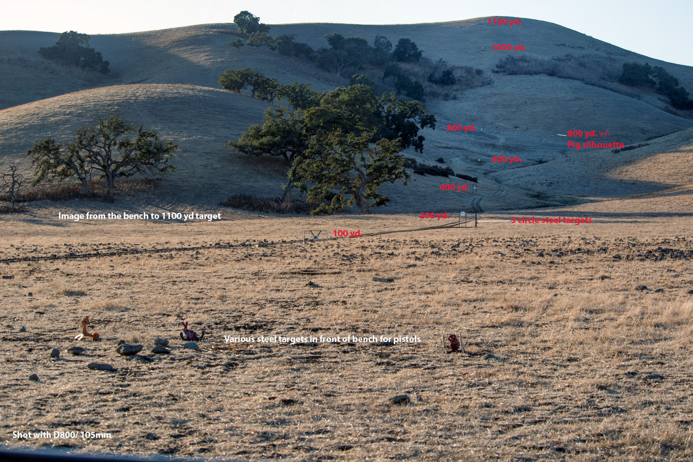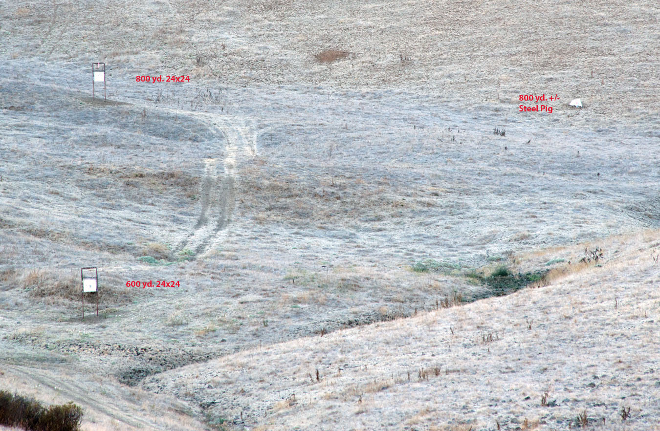 The Range: Steel at 100, 200, 400, 600, 800, 1000 and 1100 yds. At 200 next to the stand are steel circles 4-6 inches. At 800 to the right of the stand, about 25 yds., is a metallic silhouette pig also.