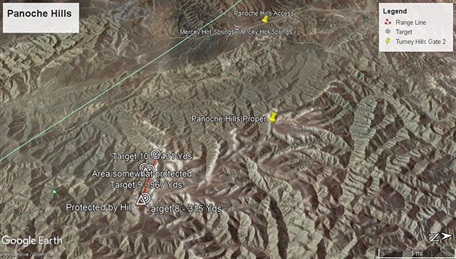 At the end of this post will be the KZM files, layers, for Google Earth Pro. I included interesting spots with ranged distances. I did not do every shooting spot but only spots that could be possible for longer range. Some spots are only 200 yds, but were interesting enough for sighting in.